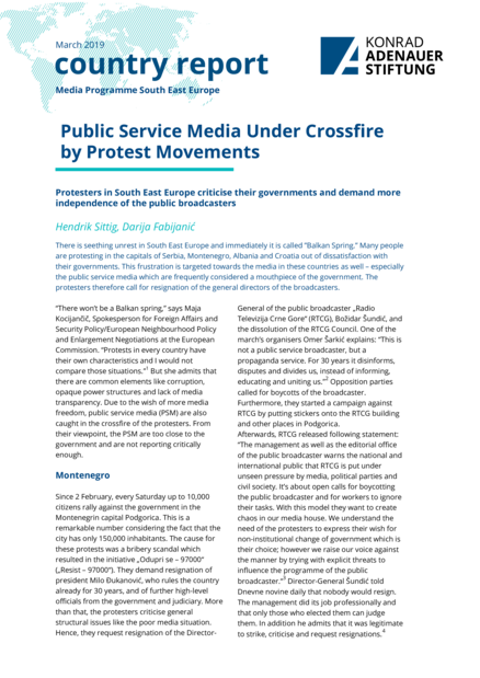 "There is seething unrest in South East Europe and immediately it is called ”Balkan Spring.” Many people are protesting in the capitals of Serbia, Montenegro, Albania and Croatia out of dissatisfaction with their governments. This frustration is targeted towards the media in these countries as well – especially the public service media which are frequently considered a mouthpiece of the government. The protesters therefore call for resignation of the general directors of the broadcasters." (Page 1)