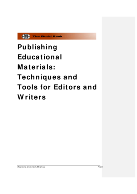 "This manual is designed to provide you with practical guidance in the work and business of writing and editing textbooks, whether you are currently working in the field, or you are studying toward it. More specifically, the manual will: provide an overview of the editing process and a basic understanding of the roles involved; provide guidance on the business practices involved in editing and publishing. The manual was written to accompany the course Publishing Educational Materials: Techiques and Tools for Editors and Writers, produced by the World Bank in 2008. In most cases information from the course is not repeated in the manual." (Introduction, page 5)