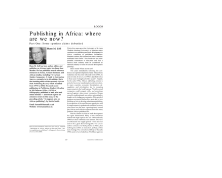 "An attempt to analyze the state of the book industries in sub-Saharan Africa thirty-five years after the major conference on publishing and book development in Africa that was held at the University of Ife (now Obafemi Awolowo University), Nigeria, in 1973. Part one of this two-part article starts off with a look at the wider picture of development on the continent, and the support – or the lack of it rather for the most part – for publishing, books and libraries by successive African governments over the last three decades. In examining the very substantial body of literature that has been written on African publishing and book development over the last two decades, the author believes a great deal of it is still characterized by far too much generalization, and that there have been dozens of articles recently containing sweeping, mostly unsubstantiated statements to explain the current unsatisfactory state of the book industries in Africa and the factors that hold back its development." (Hans M. Zell, Publishing, Books & Reading in Sub-Saharan Africa, 3d ed. 2008, nr. 2520)