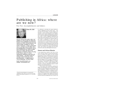 "Reviews the activities and achievements of a number of African book trade and book promotional organizations, thereafter examines the progress that has been achieved in some areas affecting the book sector, and discusses issues such as the World Bank as a major player in African publishing, digital media and African publishing, Internet access by the African book professions, collaboration and knowledge sharing, production quality, research and documentation, and African books in the international market place. The author concludes “while two or three decades ago it might have been correct to describe African publishing as extremely underdeveloped, this is certainly not the picture now. It is true of course that many formidable obstacles and challenges remain, including weak technology infrastructures, high distribution costs, the lack of coherent national book policies, high tariff barriers, illiteracy, extreme poverty, and little disposable income, among them. Nevertheless, significant gains have been made, and there have been several collective efforts to build capacity. Not all of them have been successful, and there have been many setbacks and disappointments too, notably APNET, but it is vital to build on the gains. While both governments and donors have heavily invested in education over the years, support for the book sector and library development, paradoxically, has remained quite dismal for the most part. Sadly, thirty-five years after the Ife conference, most African governments still don’t seem to appreciate that a flourishing book and reading culture is central to, and an indicator of, development in any country." (Hans M. Zell, Publishing, Books & Reading in Sub-Saharan Africa, nr. 2521, online at http://www.hanszell.co.uk/pbrssa/index.shtml)