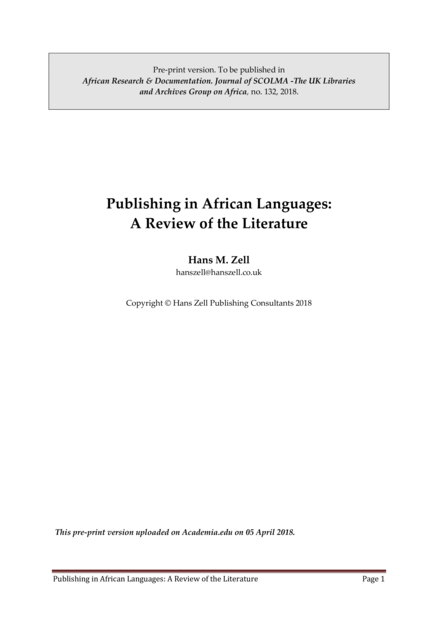 "This literature survey is an attempt to bring together some of the literature on an important and challenging, and one could well say neglected aspect of the African book sector, that of publishing in African languages, an area that greatly impacts literary production in many ways. It aims to make a small contribution to the ongoing debate about publishing of indigenous language materials, how the profile of indigenous language publishing might be enhanced—and how publishing in African languages could be conducted as a societally beneficial, sustainable, and profitable commercial activity. Following an introductory overview of current publishing in African languages – and a discussion of its many barriers to success – it lists a total of 170 records, covering the literature (in English) published since the 1970s and through to early 2018. Fully annotated and/or with abstracts, it includes books, chapters in books and edited collections, reports, journal articles, Internet documents, theses and dissertations, as well as a number of blog postings. As is evident from the literature survey, the topic of publishing in African languages still amounts to a relatively modest body of literature, although it has been growing in recent years. There have been a good number of significant, indeed even ground-breaking studies and investigations about multilingual publishing in Africa, but the literature review also demonstrates that many African countries are still poorly served in terms of research on publishing in indigenous languages." (https://www.academia.edu)