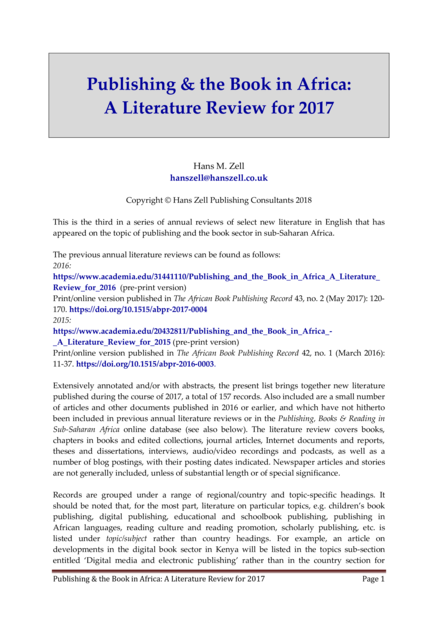"The third in a series of annual reviews of select new literature in English that has appeared on the topic of publishing and the book sector in sub-Saharan Africa. Extensively annotated and/or with abstracts, the present list brings together new literature published during the course of 2017, a total of 157 records." (Academia.edu)
