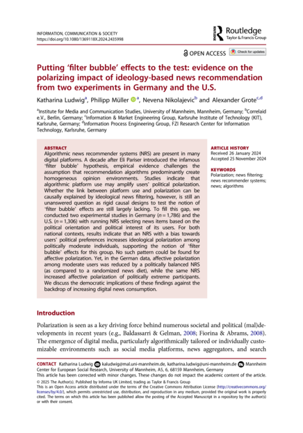 "Algorithmic news recommender systems (NRS) are present in many digital platforms. A decade after Eli Pariser introduced the infamous ‘filter bubble’ hypothesis, empirical evidence challenges the assumption that recommendation algorithms predominantly create homogeneous opinion environments. Studies indicate that algorithmic platform use may amplify users’ political polarization. Whether the link between platform use and polarization can be causally explained by ideological news filtering, however, is still an unanswered question as rigid causal designs to test the notion of ‘filter bubble’ effects are still largely lacking. To fill this gap, we conducted two experimental studies in Germany (n = 1,786) and the U.S. (n = 1,306) with running NRS selecting news items based on the political orientation and political interest of its users. For both national contexts, results indicate that an NRS with a bias towards users’ political preferences increases ideological polarization among politically moderate individuals, supporting the notion of ‘filter bubble’ effects for this group. No such pattern could be found for affective polarization. Yet, in the German data, affective polarization among moderate users was reduced by a politically balanced NRS (as compared to a randomized news diet), while the same NRS increased affective polarization of politically extreme participants. We discuss the democratic implications of these findings against the backdrop of increasing digital news consumption." (Abstract)