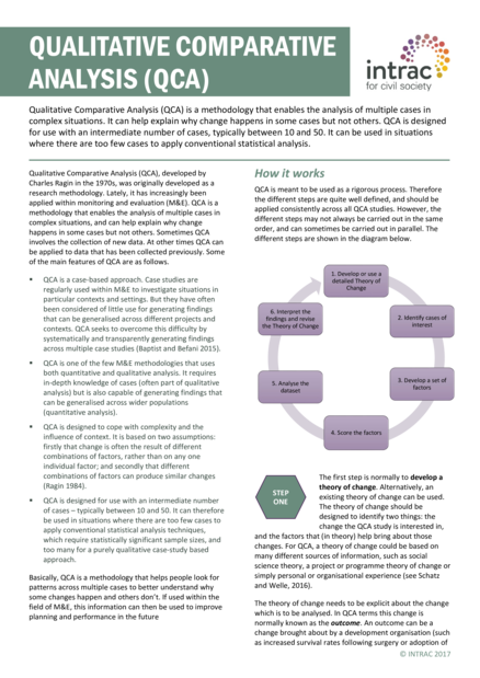 "Qualitative Comparative Analysis (QCA) is a methodology that enables the analysis of multiple cases in complex situations. It can help explain why change happens in some cases but not others. QCA is designed for use with an intermediate number of cases, typically between 10 and 50. It can be used in situations where there are too few cases to apply conventional statistical analysis." (Introduction)