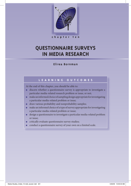 "This chapter gives an overview of the theory and practices associated with questionnaire surveys as a quantitative methodology, with specific reference to the ways in which surveys are used in media research. An application of how questionnaire surveys are used in audience research is illustrated by a case study." (Page 422)