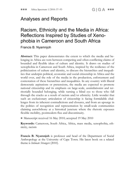 "This paper was presented as keynote address to the Conference on “Racism, Ethnicity and the Media in Africa” held on 25/26 March 2010 in London and, after a review process, has been accepted for publication in full length as an analysis on a topical current theme." (Page 58)