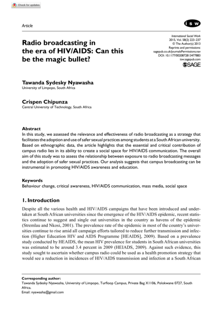 "In this study, we assessed the relevance and effectiveness of radio broadcasting as a strategy that facilitates the adoption and use of safer sexual practices among students at a South African university. Based on ethnographic data, the article highlights that the essential and critical contribution of campus radio lies in its ability to create a social space for HIV/AIDS communication. The overall aim of this study was to assess the relationship between exposure to radio broadcasting messages and the adoption of safer sexual practices. Our analysis suggests that campus broadcasting can be instrumental in promoting HIV/AIDS awareness and education." (Abstract)