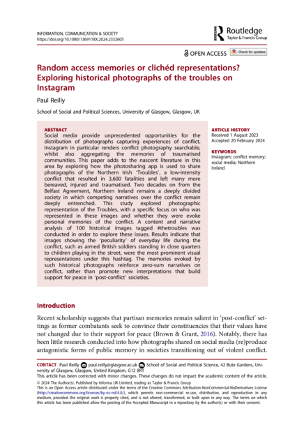 "Social media provide unprecedented opportunities for the distribution of photographs capturing experiences of conflict. Instagram in particular renders conflict photography searchable, whilst also aggregating the memories of traumatised communities. This paper adds to the nascent literature in this area by exploring how the photosharing app is used to share photographs of the Northern Irish ‘Troubles’, a low-intensity conflict that resulted in 3,600 fatalities and left many more bereaved, injured and traumatised. Two decades on from the Belfast Agreement, Northern Ireland remains a deeply divided society in which competing narratives over the conflict remain deeply entrenched. This study explored photographic representation of the Troubles, with a specific focus on who was represented in these images and whether they were evoke personal memories of the conflict. A content and narrative analysis of 100 historical images tagged #thetroubles was conducted in order to explore these issues. Results indicate that images showing the ‘peculiarity’ of everyday life during the conflict, such as armed British soldiers standing in close quarters to children playing in the street, were the most prominent visual representations under this hashtag. The memories evoked by such historical photographs reinforce zero-sum narratives on conflict, rather than promote new interpretations that build support for peace in ‘post-conflict’ societies." (Abstract)