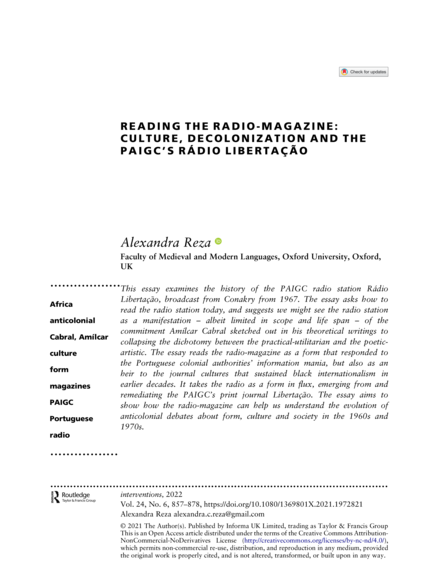"This essay examines the history of the PAIGC radio station Rádio Libertação, broadcast from Conakry from 1967. The essay asks how to read the radio station today, and suggests we might see the radio station as a manifestation – albeit limited in scope and life span – of the commitment Amílcar Cabral sketched out in his theoretical writings to collapsing the dichotomy between the practical-utilitarian and the poeticartistic. The essay reads the radio-magazine as a form that responded to the Portuguese colonial authorities’ information mania, but also as an heir to the journal cultures that sustained black internationalism in earlier decades. It takes the radio as a form in flux, emerging from and remediating the PAIGC’s print journal Libertação. The essay aims to show how the radio-magazine can help us understand the evolution of anticolonial debates about form, culture and society in the 1960s and 1970s." (Abstract)