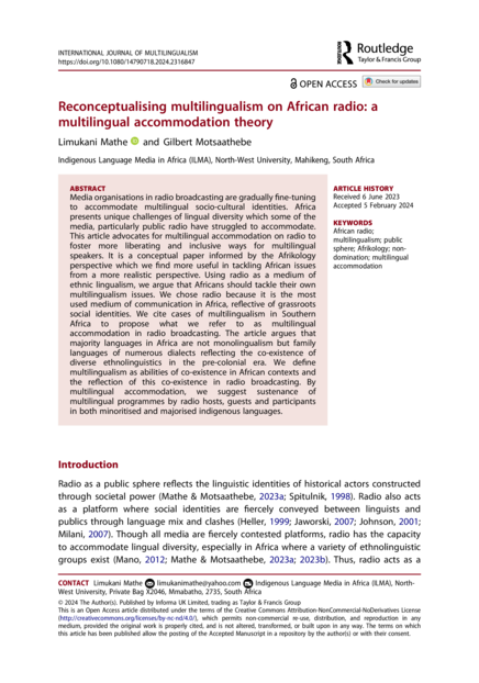 "Media organisations in radio broadcasting are gradually fine-tuning to accommodate multilingual socio-cultural identities. Africa presents unique challenges of lingual diversity which some of the media, particularly public radio have struggled to accommodate. This article advocates for multilingual accommodation on radio to foster more liberating and inclusive ways for multilingual speakers. It is a conceptual paper informed by the Afrikology perspective which we findmore useful in tackling African issues from a more realistic perspective. Using radio as a medium of ethnic lingualism, we argue that Africans should tackle their own multilingualism issues. We chose radio because it is the most used medium of communication in Africa, reflective of grassroots social identities. We cite cases of multilingualism in Southern Africa to propose what we refer to as multilingual accommodation in radio broadcasting. The article argues that majority languages in Africa are not monolingualism but family languages of numerous dialects reflecting the co-existence of diverse ethnolinguistics in the pre-colonial era. We define multilingualism as abilities of co-existence in African contexts and the reflection of this co-existence in radio broadcasting. By multilingual accommodation, we suggest sustenance of multilingual programmes by radio hosts, guests and participants in both minoritised and majorised indigenous languages." (Abstract)