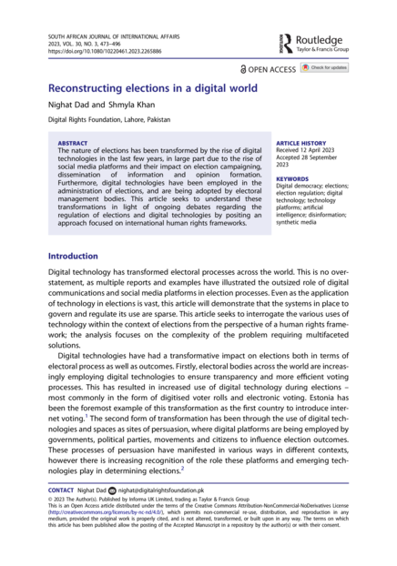 "The nature of elections has been transformed by the rise of digital technologies in the last few years, in large part due to the rise of social media platforms and their impact on election campaigning, dissemination of informationand opinion formation. Furthermore, digital technologies have been employed in the administration of elections, and are being adopted by electoral management bodies. This article seeks to understand these transformations in light of ongoing debates regarding the regulation of elections and digital technologies by positing an approach focused on international human rights frameworks." (Abstract)