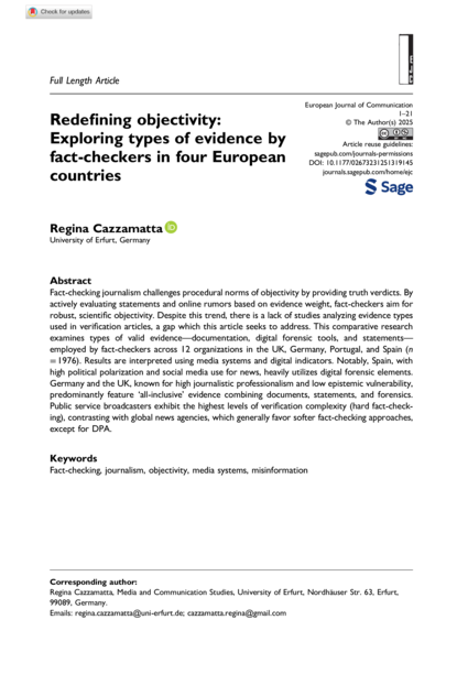 "Fact-checking journalism challenges procedural norms of objectivity by providing truth verdicts. By actively evaluating statements and online rumors based on evidence weight, fact-checkers aim for robust, scientific objectivity. Despite this trend, there is a lack of studies analyzing evidence types used in verification articles, a gap which this article seeks to address. This comparative research examines types of valid evidence—documentation, digital forensic tools, and statements—employed by fact-checkers across 12 organizations in the UK, Germany, Portugal, and Spain (n=1976). Results are interpreted using media systems and digital indicators. Notably, Spain, with high political polarization and social media use for news, heavily utilizes digital forensic elements. Germany and the UK, known for high journalistic professionalism and low epistemic vulnerability, predominantly feature ‘all-inclusive’ evidence combining documents, statements, and forensics. Public service broadcasters exhibit the highest levels of verification complexity (hard fact-checking), contrasting with global news agencies, which generally favor softer fact-checking approaches, except for DPA." (Abstract)