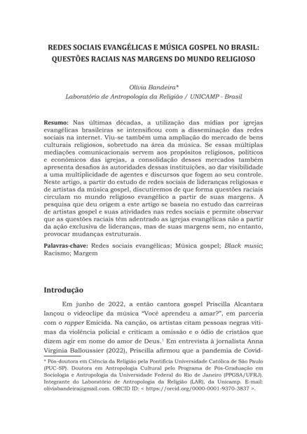 "Nas últimas décadas, a utilização das mídias por igrejas evangélicas brasileiras se intensificou com a disseminação das redes sociais na internet. Viu-se também uma ampliação do mercado de bens culturais religiosos, sobretudo na área da música. Se essas múltiplas mediações comunicacionais servem aos propósitos religiosos, políticos e econômicos das igrejas, a consolidação desses mercados também apresenta desafios às autoridades dessas instituições, ao dar visibilidade a uma multiplicidade de agentes e discursos que fogem ao seu controle. Neste artigo, a partir do estudo de redes sociais de lideranças religiosas e de artistas da música gospel, discutiremos de que forma questões raciais circulam no mundo religioso evangélico a partir de suas margens. A pesquisa que deu origem a este artigo se baseia no estudo das carreiras de artistas gospel e suas atividades nas redes sociais e permite observar que as questões raciais têm adentrado as igrejas evangélicas não a partir da ação exclusiva de lideranças, mas de suas margens sem, no entanto, provocar mudanças estruturais." (Resumo)