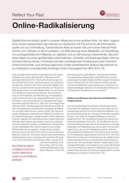 "Digitale Kommunikation spielt in unserem Alltag eine immer größere Rolle. Vor allem Jugendliche nutzen insbesondere das Internet zum Austausch mit Freund*innen als Informationsquelle und zur Unterhaltung. Extremistische Akteure wissen das und nutzen Internet-Plattformen und -Dienste zur Kommunikation, zur Rekrutierung neuer Mitglieder, zur Verbreitung von propagandistischem Material, zur Agitation und zur Vernetzung untereinander. Sie profitieren dabei von einer (größtenteils) unkontrollierten, schnellen und kostengünstigen Informationsvermittlung nahezu in Echtzeit und über Ländergrenzen hinweg sowie einer (vermeintlichen) Anonymität. Laut Verfassungsschutz nutzen extremistische Akteure das Internet um zu mobilisieren und potentielle Anhänger*innen hinzuzugewinnen." (Einführung)