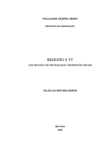 "The religious presence on TV programs has been increasing in Brazil, where churches, especially the neopentecostals, have been using the mass communication ways, especially the television, to advertise their messages and attract new followers. This project studies the usage of television by religions neopentecostals groups and intends to understand how this schedule is perceived by the young people. A research was conducted with young members of Brazilian churches Igreja Apostólica Renascer em Cristo, Bola de Neve Church, Igreja Internacional da Graça de Deus, and Igreja Universal do Reino de Deus and an analysis will be done as well of the TV shows “Clip Gospel Show”, “Bola TV”, “Show da Fé”, and “Fala Que Eu Te Escuto”, produced respectively by those religious groups." (Abstract)
