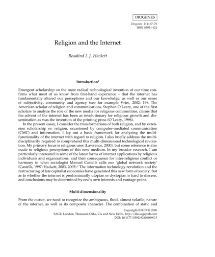 "Emergent scholarship on the most radical technological invention of our time confirms what most of us know from first-hand experience – that the internet has fundamentally altered our perceptions and our knowledge, as well as our sense of subjectivity, community and agency (see for example Vries, 2002: 19). The American scholar of religion and communications, Stephen O’Leary, one of the first scholars to analyze the role of the new media for religious communities, claims that the advent of the internet has been as revolutionary for religious growth and dissemination as was the invention of the printing press (O’Leary, 1996). In the present essay, I consider the transformations of both religion, and by extension scholarship on religion, occasioned by computer-mediated communication (CMC) and information. I lay out a basic framework for analyzing the multifunctionality of the internet with regard to religion. I also briefly address the multidisciplinarity required to comprehend this multi-dimensional technological revolution. My primary focus is religious uses (Lawrence, 2000), but some reference is also made to religious perceptions of this new medium. In my broader research, I am particularly interested in some of the latest forms of internet applications by religious individuals and organizations, and their consequence for inter-religious conflict or harmony in what sociologist Manuel Castells calls our ‘global network society’ (Castells, 1997; Hackett, 2003, 2005). The information technology revolution and the restructuring of late capitalist economies have generated this new form of society. But as to whether the internet is predominantly utopian or dystopian is hard to discern, and conclusions may be determined by one’s own interests and vantage-point." (Introduction)
