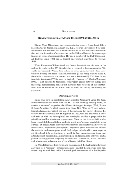 "Divine Word Missionary and communication expert Franz-Josef Eilers passed away in Manila on January 13, 2021. He was a prominent SVD communication and media expert and had dedicated his life to social communication and the formation of missionaries in the SVD and beyond for an evangelisation in terms of communication. He was a member of the SVD Missiological Institute since 1984 and a diligent and trusted contributor to Verbum SVD." (Page 116)