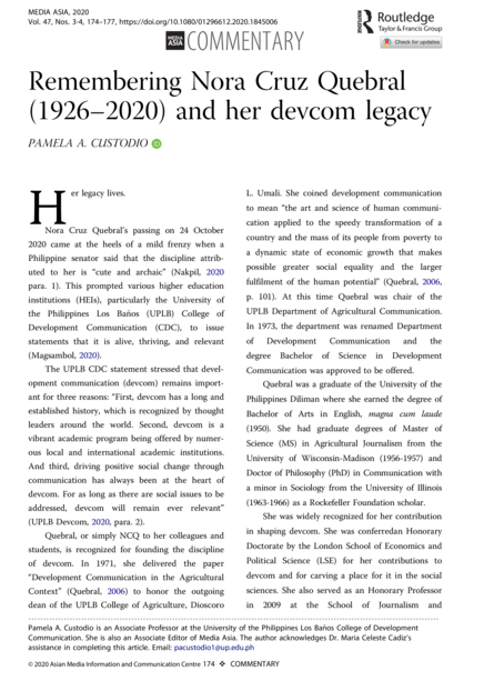 "Nora Cruz Quebral's passing on 24 October 2020 came at the heels of a mild frenzy when a Philippine senator said that the discipline attributed to her is “cute and archaic" (Nakpil, 2020 para. 1). This prompted various higher education institutions (HEIs), particularly the University of the Philippines Los Baños (UPLB) College of Development Communication (CDC), to issue statements that it is alive, thriving, and relevant (Magsambol, 2020). The UPLB CDC statement stressed that development communication (devcom) remains important for three reasons: “First, devcom has a long and established history, which is recognized by thought leaders around the world. Second, devcom is a vibrant academic program being offered by numerous local and international academic institutions. And third, driving positive social change through communication has always been at the heart of devcom. For as long as there are social issues to be addressed, devcom will remain ever relevant" (UPLB Devcom, 2020, para. 2). Quebral, or simply NCQ to her colleagues and students, is recognized for founding the discipline of devcom. In 1971, she delivered the paper “Development Communication in the Agricultural Context" (Quebral, 2006) to honor the outgoing dean of the UPLB College of Agriculture, Dioscoro L. Umali. She coined development communication to mean “the art and science of human communication applied to the speedy transformation of a country and the mass of its people from poverty to a dynamic state of economic growth that makes possible greater social equality and the larger fulfilment of the human potential" (Quebral, 2006, page 101). At this time Quebral was chair of the UPLB Department of Agricultural Communication. In 1973, the department was renamed Department of Development Communication and the degree Bachelor of Science in Development Communication was approved to be offered."