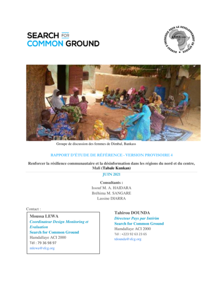 "L’étude de base du projet « Renforcer la résilience communautaire et la désinformation dans les régions du nord et du centre du Mali intitulé “Tabalé Kunkan’’ a pour but d’établir la situation de référence du projet à partir de laquelle les progrès seront mesurés. Elle a utilisé une approche mixte incluant la revue documentaire, la collecte de données quantitatives et qualitatives sur la base de questionnaires et de guides d’entretien pour répondre aux objectifs indiqués dans les termes de référence." (Résumé exécutif)