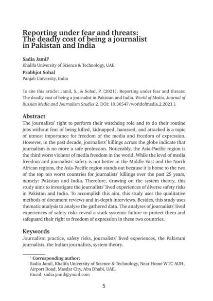 "The journalists’ right to perform their watchdog role and to do their routine jobs without fear of being killed, kidnapped, harassed, and attacked is a topic of utmost importance for freedom of the media and freedom of expression. However, in the past decade, journalists’ killings across the globe indicate that journalism is no more a safe profession. Noticeably, the Asia-Pacific region is the third worst violator of media freedom in the world. While the level of media freedom and journalists’ safety is not better in the Middle East and the North African regions, the Asia-Pacific region stands out because it is home to the two of the top ten worst countries for journalists’ killings over the past 25 years, namely: Pakistan and India. Therefore, drawing on the system theory, this study aims to investigate the journalists’ lived experiences of diverse safety risks in Pakistan and India. To accomplish this aim, this study uses the qualitative methods of document reviews and in-depth interviews. Besides, this study uses thematic analysis to analyse the gathered data. The analyses of journalists’ lived experiences of safety risks reveal a stark systemic failure to protect them and safeguard their right to freedom of expression in these two countries." (Abstract)
