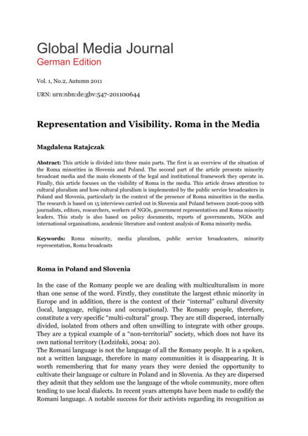 "This article is divided into three main parts. The first is an overview of the situation of the Roma minorities in Slovenia and Poland. The second part of the article presents minority broadcast media and the main elements of the legal and institutional framework they operate in. Finally, this article focuses on the visibility of Roma in the media. This article draws attention to cultural pluralism and how cultural pluralism is implemented by the public service broadcasters in Poland and Slovenia, particularly in the context of the presence of Roma minorities in the media. The research is based on 15 interviews carried out in Slovenia and Poland between 2006-2009 with journalists, editors, researchers, workers of NGOs, government representatives and Roma minority leaders. This study is also based on policy documents, reports of governments, NGOs and international organisations, academic literature and content analysis of Roma minority media." (Abstract)