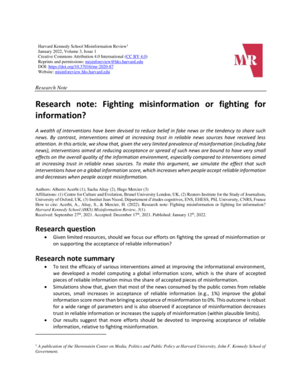 "A wealth of interventions have been devised to reduce belief in fake news or the tendency to share such news. By contrast, interventions aimed at increasing trust in reliable news sources have received less attention. In this article, we show that, given the very limited prevalence of misinformation (including fake news), interventions aimed at reducing acceptance or spread of such news are bound to have very small effects on the overall quality of the information environment, especially compared to interventions aimed at increasing trust in reliable news sources. To make this argument, we simulate the effect that such interventions have on a global information score, which increases when people accept reliable information and decreases when people accept misinformation." (Abstract)