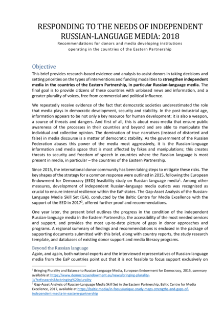 "This brief provides research-based evidence and analysis to assist donors in taking decisions and setting priorities on the types of interventions and funding modalities to strengthen independent media in the countries of the Eastern Partnership, in particular Russian-language media. The final goal is to provide citizens of these countries with unbiased news and information, and a greater plurality of voices, free from commercial and political influence." (Objective, page 1)