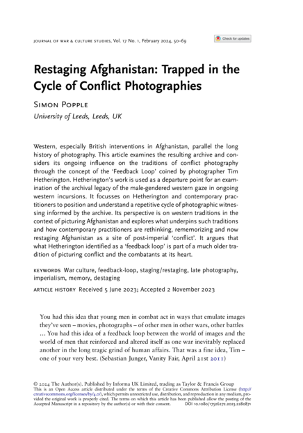 "Western, especially British interventions in Afghanistan, parallel the long history of photography. This article examines the resulting archive and considers its ongoing influence on the traditions of conflict photography through the concept of the ‘Feedback Loop’ coined by photographer Tim Hetherington. Hetherington’s work is used as a departure point for an examination of the archival legacy of the male-gendered western gaze in ongoing western incursions. It focusses on Hetherington and contemporary practitioners to position and understand a repetitive cycle of photographic witnessing informed by the archive. Its perspective is on western traditions in the context of picturing Afghanistan and explores what underpins such traditions and how contemporary practitioners are rethinking, rememorizing and now restaging Afghanistan as a site of post-imperial ‘conflict’. It argues that what Hetherington identified as a ‘feedback loop’ is part of a much older tradition of picturing conflict and the combatants at its heart." (Abstract)