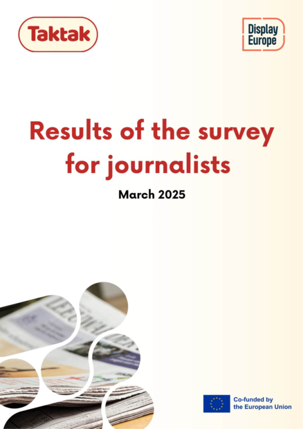 "This report presents the main results of the surveys for journalists launched by the European cofunded project Taktak in collaboration with Display Europe in July and November 2024. The surveys aimed to have an overview of the working life of journalists in Europe, and gathered 436 replies. The two surveys were both translated in 13 languages (English, Spanish, German, Catalan, Galego, Greek, Bulgarian, Ukrainian, French, Italian, Portuguese, Serbo-Croatian and Romanian). This report does not claim to be a representation of the working conditions of journalists in Europe but nevertheless gives an important insight on the subject. The respondents of the Taktak survey come from 33 different European countries (21 from EU member states, 13 from European countries and 8 non-European countries). The majority of respondents are experienced journalists aged between 40 and 49 years old (29,13%), and almost half of them, 49,7%, have been working for more than 15 years as a journalist. Also, for 61% of them, their journalistic work represents about 80-100% of their income [...]