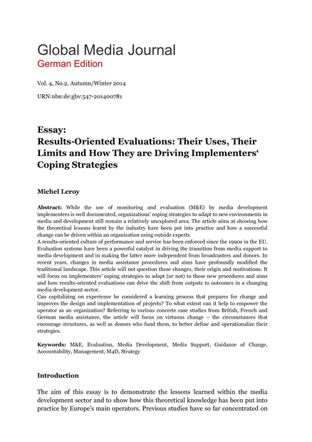 "A results-oriented culture of performance and service has been enforced since the 1990s in the EU. Evaluation systems have been a powerful catalyst in driving the transition from media support to media development and in making the latter more independent from broadcasters and donors. In recent years, changes in media assistance procedures and aims have profoundly modified the traditional landscape. This article will not question these changes, their origin and motivations. It will focus on implementers’ coping strategies to adapt (or not) to these new procedures and aims and how results-oriented evaluations can drive the shift from outputs to outcomes in a changing media development sector." (Abstract)