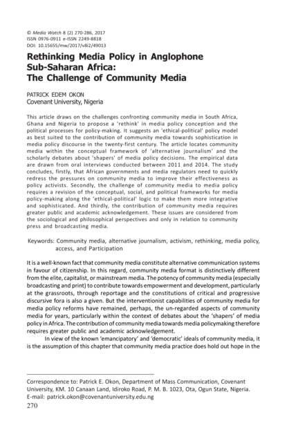 Rethinking Media Policy in Anglophone Sub-Saharan Africa: The Challenge of Community Media