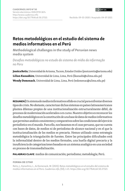 "Un sistema de medios informativos sólido es crucial para enfrentar diversos tipos de crisis. No obstante, caracterizar dichos sistemas en países latinoamericanos plantea dilemas propios de una institucionalización estructuralmente débil, de procesos de modernización acelerados o en curso. Nuestro objetivo es reconocer los desafíos metodológicos en la constitución de una base de datos de medios informativos que permitan análisis consistentes y comparativos sobre las condiciones del ejercicio periodístico en el mundo. Para ello, nos basamos en el caso peruano, que no cuenta con bases de datos, de medios ni de periodistas de alcance nacional y en el que la institucionalización de los medios es precaria. Hemos utilizado como estrategia metodológica la triangulación de fuentes. Entre las principales dificultades está la informalidad dentro de los medios formales, una huella digital precaria y la insuficiencia de categorizaciones basadas en un sistema analógico en una sociedad en proceso de transmedialización." (Resumen)
