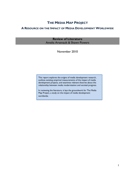 "This report explores the origins of media development research, outlines existing empirical measurements of the impact of media development projects, and examines relevant theories about the relationship between media modernization and societal progress." (Page 1)