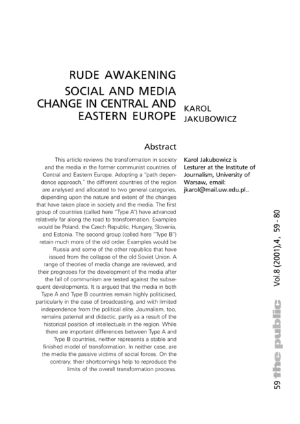 "This article reviews the transformation in society and the media in the former communist countries of Central and Eastern Europe. Adopting a path dependence approach, "the different countries of the region are analysed and allocated to two general categories, depending upon the nature and extent of the changes that have taken place in society and the media. The first group of countries (called here 'Type A') have advanced relatively far along the road to transformation. Examples would be Poland, the Czech Republic, Hungary, Slovenia, and Estonia. The second group (called here 'Type B') retain much more of the old order. Examples would be Russia and some of the other republics that have issued from the collapse of the old Soviet Union. A range of theories of media change are reviewed, and their prognoses for the development of the media after the fall of communism are tested against the subsequent developments. It is argued that the media in both Type A and Type B countries remain highly politicised, particularly in the case of broadcasting, and with limited independence from the political elite. Journalism, too, remains paternal and didactic, partly as a result of the historical position of intellectuals in the region. While there are important differences between Type A and Type B countries, neither represents a stable and finished model of transformation. In neither case, are the media the passive victims of social forces. On the contrary, their shortcomings help to reproduce the limits of the overall transformation process." (Abstract)