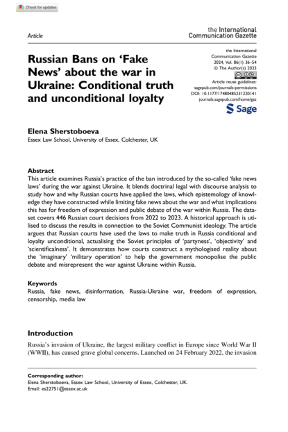 "This article examines Russia’s practice of the ban introduced by the so-called ‘fake news laws’ during the war against Ukraine. It blends doctrinal legal with discourse analysis to study how and why Russian courts have applied the laws, which epistemology of knowledge they have constructed while limiting fake news about the war and what implications this has for freedom of expression and public debate of the war within Russia. The dataset covers 446 Russian court decisions from 2022 to 2023. A historical approach is utilised to discuss the results in connection to the Soviet Communist ideology. The article argues that Russian courts have used the laws to make truth in Russia conditional and loyalty unconditional, actualising the Soviet principles of ‘partyness’, ‘objectivity’ and ‘scientificalness’. It demonstrates how courts construct a mythologised reality about the ‘imaginary’ ‘military operation’ to help the government monopolise the public debate and misrepresent the war against Ukraine within Russia." (Abstract)