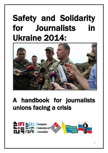 "Throughout 2014 the IFJ and EFJ have been working hand in hand with affiliates, the National Union of Journalists of Ukraine, the Independent Media Trade Union of Ukraine and the Russian Union of Journalists to support their members in the field, condemn the intimidation of journalists and manipulation of media and to maintain a professional co-operation between journalists across the conflict. The unions have shown great courage and leadership and we can be very proud of their responses. We are also grateful to the support of Dunja Mijatovic, Representative on Freedom of the Media for the Organisation for Security and Co-operation in Europe for initiating a dialogue between the journalists unions in the spring of 2014. Since then six meetings have taken place that have been vital in building the climate of trust and co-operation. The process has not been easy, there have been tensions and sometimes serious disagreements, but there has been a remarkably broad areas of agreement, both on the principles that underline our profession and on areas of practical action to support and protect our members. This handbook was one initiative from this process and attempts to document the conflict through the eyes of the journalists and the unions. It draws on the joint monitoring and reporting that was conducted by the unions to record the major incidents against journalists in Ukraine and in Russia when related to the conflict. Through a series of interviews with journalists who have been in the war zone it provides an occasionally rough but authentic voice of the reporters and their experiences. The value of proper safety training and preparation for any correspondent is a major theme with interviews packed with advice to journalists contemplating heading to the front line." (Preface)