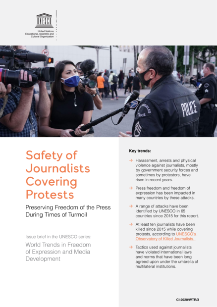"Key trends: Harassment, arrests and physical violence against journalists, mostly by government security forces and sometimes by protestors, have risen in recent years; Press freedom and freedom of expression has been impacted in many countries by these attacks; A range of attacks have been identified by UNESCO in 65 countries since 2015 for this report; At least ten journalists have been killed since 2015 while covering protests, according to UNESCO’s Observatory of Killed Journalists; Tactics used against journalists have violated international laws and norms that have been long agreed upon under the umbrella of multilateral institutions." (Page 1)