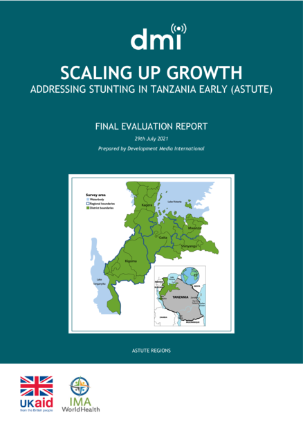 "This report presents the findings from the evaluation of the ASTUTE media campaign. Three cross-sectional surveys were conducted before, during, and at the end of the campaign, with questions targeted to female caregivers and male heads of households when they were available. The impact of the campaign is estimated by looking at change in key indicators over time (an uncontrolled before-and-after analysis) as well as the association of indicators with reported campaign exposure (cross-sectional analysis at endline). Primary and secondary outcomes were pre-specified for each of the message themes prior to analysis. Over 21,000 men and women with children under two were surveyed across the three timepoints, and the majority of participants reported exposure to the campaign. At endline, 60% of female caregivers and 70% of men had heard or seen spots on the radio or TV. While exposure was even higher among regular radio listeners, the campaign still reached over 40% of individuals who did not report listening regularly. This high level of campaign exposure translated to large impacts across several of the programme themes. The strongest, most consistent evidence for impact was observed for engagement in early childhood development-related activities (for both men and women), for outcomes relating to maternal health and nutrition (including antenatal care attendance) and for WASH indicators. Exclusive breastfeeding indicators also improved over the time period of the campaign, and by the end of the campaign the prevalence of positive outcomes for the majority of breastfeeding indicators had reached a high level (>90%) such that the campaign may have had limited ability to achieve further improvements. Complementary feeding indicators also improved over the time span of the campaign. However the proportions of children receiving the target minimum meal frequency and minimum acceptable diet by the end of the campaign remained low with limited evidence that exposure to the campaign had had a substantial impact on these indicators." (Executive summary)
