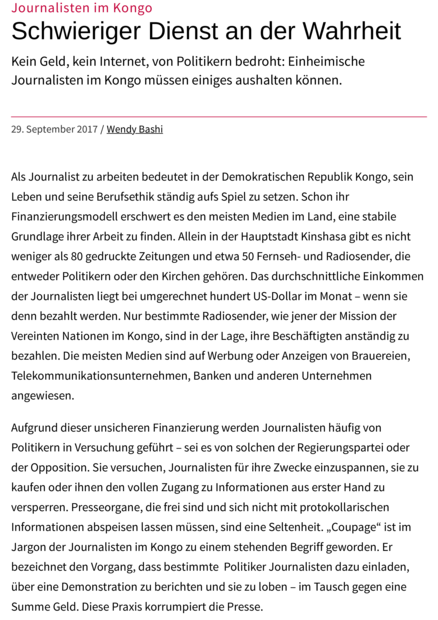 "Als Journalist zu arbeiten bedeutet in der Demokratischen Republik Kongo, sein Leben und seine Berufsethik ständig aufs Spiel zu setzen. Schon ihr Finanzierungsmodell erschwert es den meisten Medien im Land, eine stabile Grundlage ihrer Arbeit zu finden. Allein in der Hauptstadt Kinshasa gibt es nicht weniger als 80 gedruckte Zeitungen und etwa 50 Fernseh- und Radiosender, die entweder Politikern oder den Kirchen gehören. Das durchschnittliche Einkommen der Journalisten liegt bei umgerechnet hundert US-Dollar im Monat - wenn sie denn bezahlt werden." (Seite 22)