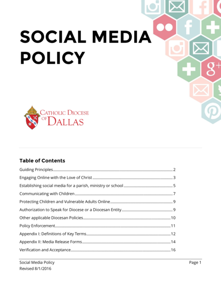 "Every day, countless conversations take place online about the Catholic faith on social media, and the Diocese of Dallas encourages Church and School personnel to join these conversations to proclaim the Gospel. The Diocese of Dallas also respects the rights of Church and School personnel to use social media as a form of self-expression. It is important that we make every effort to ensure the safety of producers and consumers of social media, while at the same time ensuring the integrity of the message we proclaim. This requires responsible, focused, and intentional use of new and yet-to-be-developed technologies. These guidelines apply to all Church and School personnel (employees, clergy and all volunteers), and to their use of social networking sites, blogs, or any other kind of social media. Other websites are usually not considered social media, but this policy also applies to the creation, content and use of parish, school, and ministry websites, as well as to online discussion by any Church and School personnel of matters pertaining to ministry." (Page 2)