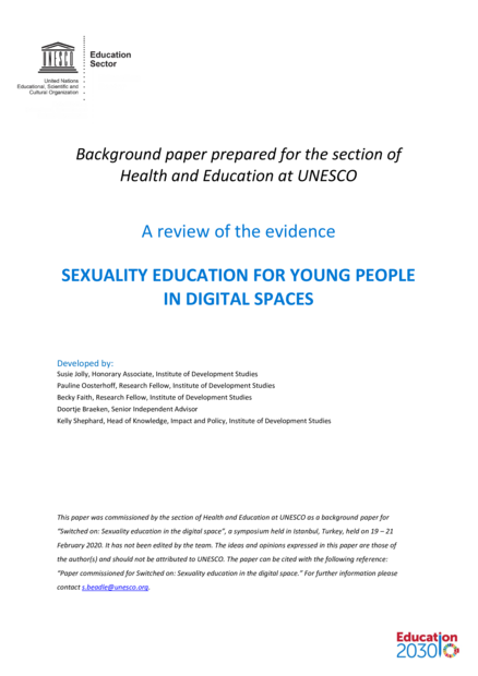 "This desk review examines the available evidence on the extent to which digital content can influence knowledge, attitudes and practices of adolescents and young people (aged 10–24 years), and looks at the potential for digital spaces to be used to add value to the delivery of comprehensive sexuality education (CSE). Technologies are constantly changing, so this report should be seen as a snapshot of the evidence at a specific point in time. The report is in two parts. Part 1 explores which young people engage with digital spaces and how; social media influencers; the intersections between pornography and sexuality education; and lessons from mHealth and Information and Communication Technology (ICT) in education. To do this, it draws on purposive searches of the literature, the knowledge and expertise of the interdisciplinary team of researchers, and recommendations from a range of experts. Part 2 draws on a robust review of the literature on interventions designed to educate young people about sexuality. It focuses on existing evidence in five key areas: (1) reaching and engaging young people; (2) influence and impact; (3) opportunities and risks; (4) content, guidelines and standards; and (5) literature gaps." (Executive summary)