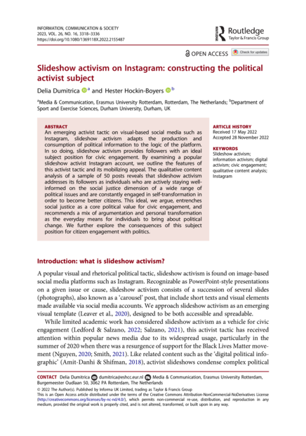 "An emerging activist tactic on visual-based social media such as Instagram, slideshow activism adapts the production and consumption of political information to the logic of the platform. In so doing, slideshow activism provides followers with an ideal subject position for civic engagement. By examining a popular slideshow activist Instagram account, we outline the features of this activist tactic and its mobilizing appeal. The qualitative content analysis of a sample of 50 posts reveals that slideshow activism addresses its followers as individuals who are actively staying wellinformed on the social justice dimension of a wide range of political issues and are constantly engaged in self-transformation in order to become better citizens. This ideal, we argue, entrenches social justice as a core political value for civic engagement, and recommends a mix of argumentation and personal transformation as the everyday means for individuals to bring about political change. We further explore the consequences of this subject position for citizen engagement with politics." (Abstract)
