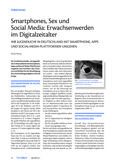 "Der Artikel beschreibt, wie Jugendliche in Deutschland mit Smartphone, Apps und Social-Media-Plattformen umgehen und inwiefern dies Chancen und Risiken bei der Bewältigung ihrer Entwicklungsaufgaben mit sich bringt." (Seite 12)