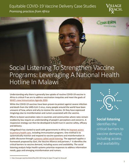 "VillageReach has started to work with governments in Africa to improve access to primary health care, including immunization programs. One method is to systematically monitor and respond to vaccine questions and misinformation in public discourse through a process called social listening. The approach applies a framework proposed by Gavi, the Vaccine Alliance and partners. It identifies the critical barriers to vaccine demand, including access and availability. The social listening analysis helps health systems prioritize responses to address information needs, gaps and emerging misinformation and rumors." (Page 1)
