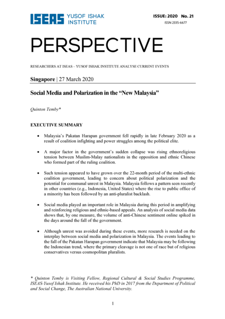 "Malaysia’s Pakatan Harapan government fell rapidly in late February 2020 as a result of coalition infighting and power struggles among the political elite. A major factor in the government’s sudden collapse was rising ethnoreligious tension between Muslim-Malay nationalists in the opposition and ethnic Chinese who formed part of the ruling coalition. Such tension appeared to have grown over the 22-month period of the multi-ethnic coalition government, leading to concern about political polarization and the potential for communal unrest in Malaysia. Malaysia follows a pattern seen recently in other countries (e.g., Indonesia, United States) where the rise to public office of a minority has been followed by an anti-pluralist backlash. Social media played an important role in Malaysia during this period in amplifying and reinforcing religious and ethnic-based appeals. An analysis of social media data shows that, by one measure, the volume of anti-Chinese sentiment online spiked in the days around the fall of the government. Although unrest was avoided during these events, more research is needed on the interplay between social media and polarization in Malaysia. The events leading to the fall of the Pakatan Harapan government indicate that Malaysia may be following the Indonesian trend, where the primary cleavage is not one of race but of religious conservatives versus cosmopolitan pluralists." (Executive summary)