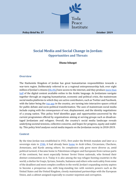 "The Hashemite Kingdom of Jordan has great humanitarian responsibilities towards a war-torn region. Deliberately referred to as a regional entrepreneurship hub, over eight million of Jordan’s citizens (86.4%) have access to the internet, and they produce more than half of the digital content available online in the Arabic language. As Jordanians navigate together through an ongoing humanitarian, economic and political crisis, the mainstream social media platforms to which they are active contributors, such as Twitter and Facebook, with the latter being the top app in the country, are turning into interactive spaces critical for public debate and socio-political transformation. The uses of mainstream social media include coping with the consequences of war, displacement, and the identity negotiations of a young nation. This policy brief identifies gaps and opportunities uncovered by the current programmes offered by organisations aiming at serving groups such as disadvantaged Jordanians and refugees. Overall, the country’s social media landscape reveals underlying societal tensions, collective concerns, and hopes for progress, equity and stability. This policy brief analyses social media impacts on the Jordanian society in 2018-2019." (Overview)