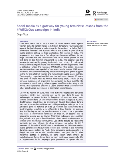 "Over New Year’s Eve in 2016, a slew of sexual assault cases against women came to light in India’s tech hub of Bengaluru. Four years prior, against the backdrop of a violent rape in the nation’s capital of Delhi, prominent feminists and activists took to the streets as part of mass public protests calling for legal protections for women in India. The response to the New Year’s Eve allegations, however, differed in two ways. The first was the conspicuous role social media played for the first time in the feminist movement in India. The second was the leadership provided by young feminists in the country. A coalition of various feminist organisations and individuals banded together to form a collective under the hashtag #IWillGoOut. This article discusses feminist activism over a period of two weeks at the start of 2017, when the #IWillGoOut collective rapidly mobilised widespread public support calling for the safety of women and minorities in public spaces in India. The campaign organised and led marches and events in over 30 towns and cities of India with no formal fundraising effort. I draw on my personal experience of organising the campaign to share insights into its success in transforming online support to offline action using social media. This experience provides a useful example that can be used in other social justice movements in the Indian subcontinent." (Abstract)