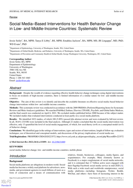 "The aim of this review is to identify and describe the available literature on effective social media–based behavior change interventions within low- and middle-income countries [...] Results: We identified 1832 studies, of which 108 (5.89%) passed title-abstract review and were evaluated by full-text review. In all, 30.6% (33/108) were included in the final analysis. Although 22 studies concluded that the social media intervention was effective, only 13 quantified the level of social media engagement, of which, few used theory (n=8) or a conceptual model (n=5) of behavior change. Conclusions: We identified gaps in the settings of interventions, types and sectors of interventions, length of follow-up, evaluation techniques, use of theoretical and conceptual models, and discussions of the privacy implications of social media use." (Abstract)