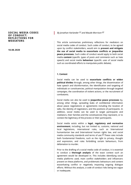 "This article summarises preliminary reflections for mediators on social media codes of conduct. Such codes of conduct, to be agreed upon by conflict stakeholders, would aim to prevent and mitigate the use of social media to exacerbate conflicts or jeopardise peace processes. Such codes of conduct would apply to both social media content (specific types of posts and comments such as hate speech) and social media behaviour (specific uses of social media such as coordinated efforts to manipulate public debate)." (Page 1)