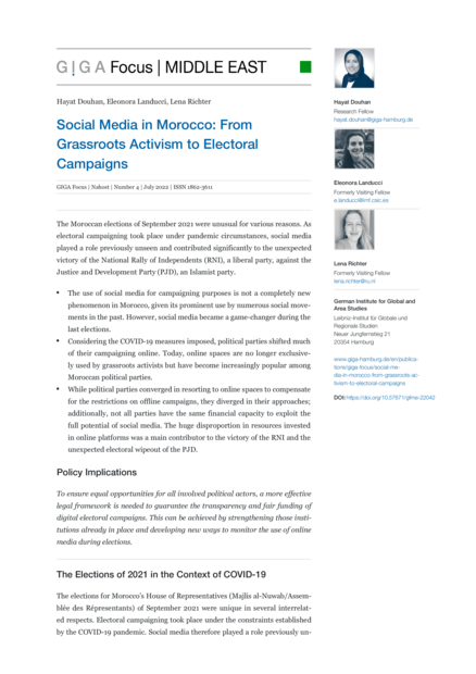 "The Moroccan elections of September 2021 were unusual for various reasons. As electoral campaigning took place under pandemic circumstances, social media played a role previously unseen and contributed significantly to the unexpected victory of the National Rally of Independents (RNI), a liberal party, against the Justice and Development Party (PJD), an Islamist party. The use of social media for campaigning purposes is not a completely new phenomenon in Morocco, given its prominent use by numerous social movements in the past. However, social media became a game-changer during the last elections. Considering the COVID-19 measures imposed, political parties shifted much of their campaigning online. Today, online spaces are no longer exclusively used by grassroots activists but have become increasingly popular among Moroccan political parties. While political parties converged in resorting to online spaces to compensate for the restrictions on offline campaigns, they diverged in their approaches; additionally, not all parties have the same financial capacity to exploit the full potential of social media. The huge disproportion in resources invested in online platforms was a main contributor to the victory of the RNI and the unexpected electoral wipeout of the PJD." (Abstract)